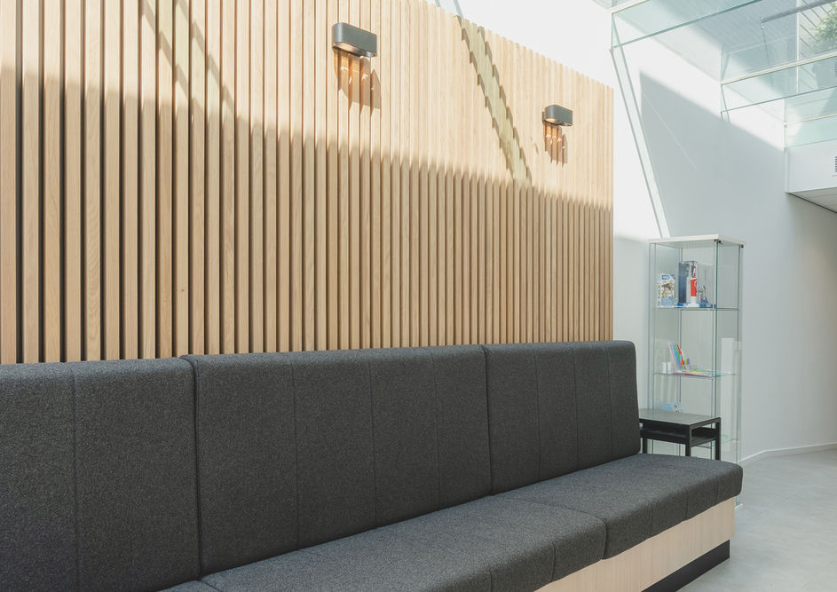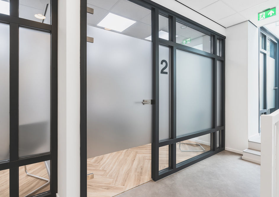 een moderne praktijk met veel glas en karakteristieke elementen.