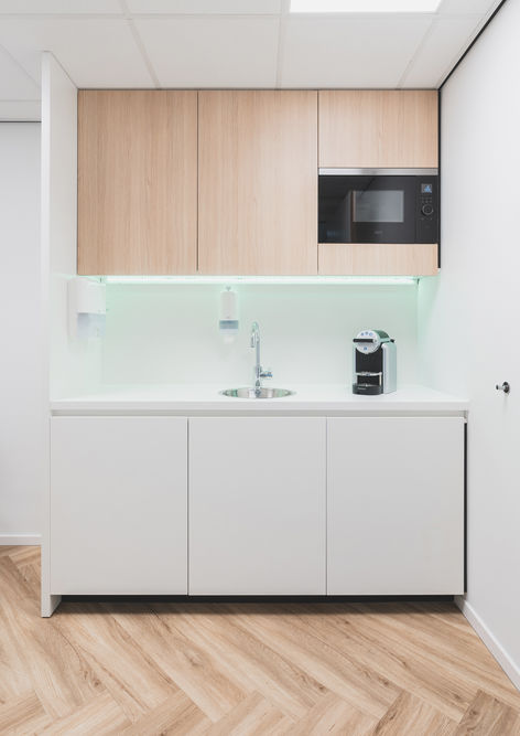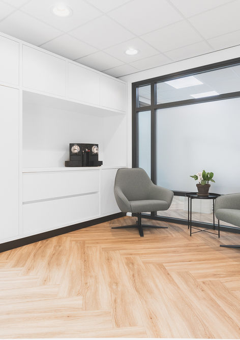 Dankzij de glazen voorzijde van het pand is de praktijk zeer licht en oogt deze ruimtelijk. "Het is voor mij essentieel dat patiënten zich 'thuis' voelen en vertrouwen hebben. Onze gastvrije aanpak wordt positief ervaren door onze patiënten," vertelt Stéphanie enthousiast. De praktijk straalt rust en warmte uit door het gebruik van groene en beige kleurtinten, evenals veel hout en glas. Stéphanie liet zich inspireren door de Scandinavische sfeer en elementen van een boetiekhotel. De lange strakke bank met uniek bovenlicht, het koffieapparaat en de mooie balie in de wachtruimte maken de ontvangst voor iedere patiënt bijzonder. Kortom, een vriendelijke praktijk waar je tijdens het winkelen snel even naar binnen loopt voor een afspraak.