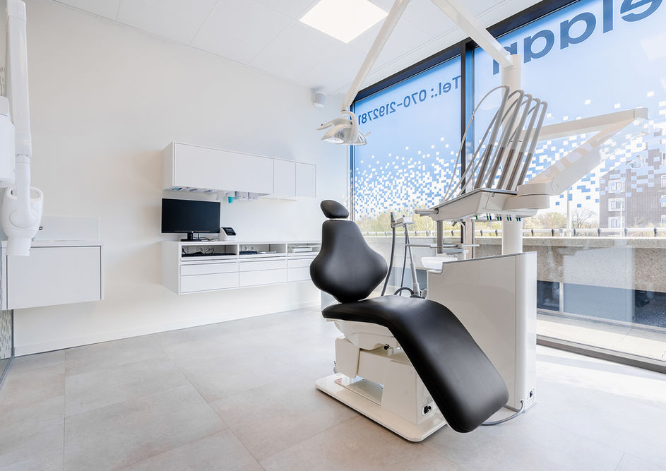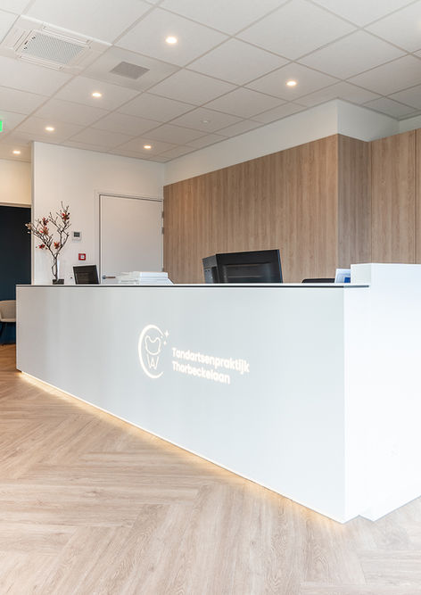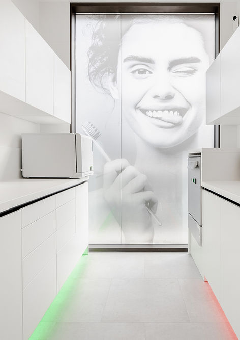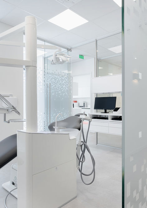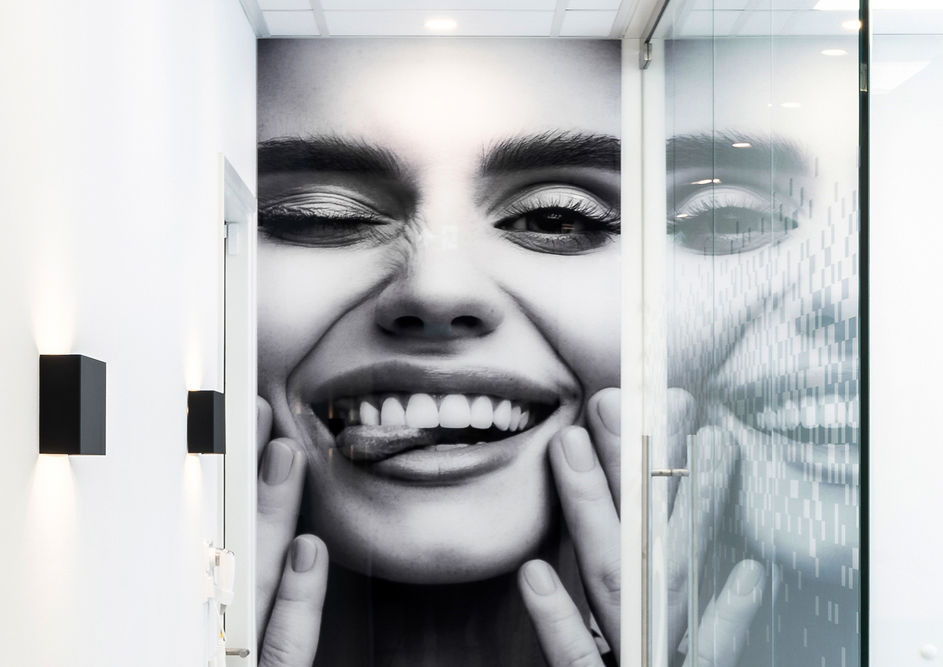 Het glasomgeven design, de zwevende 12-uursmeubels en de mooie print aan het eind van de gang zorgen voor een modieuze, high-tech uitstraling. In de wachtkamer vormt het zwevende bankstel, de moderne balie met houten achterwand en de visgraatvloer een warm welkom. De naadloze overgang van de ontvangstruimte naar de klinische ruimtes, dankzij het vele glas, zorgt voor een klinische, warme uitstraling.